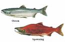 The adult spawners are unique in appearance. They typically turn bright red, with a green head; hence they are commonly called “red” salmon in Alaska. During the ocean and adult migratory phase, sockeye often have a bluish back and silver sides, giving rise to another common name, “bluebacks.” The name “sockeye” is thought to have been a corruption of the various Indian tribes’ word “sukkai.”